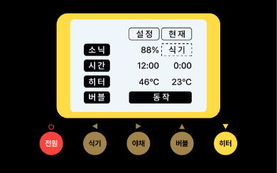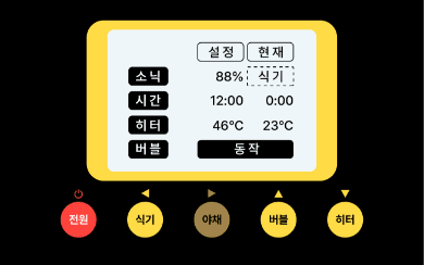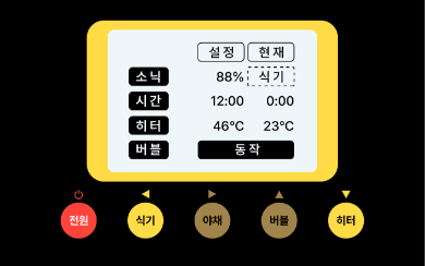 물을 받고 전원버튼을 누르고, 히터버튼을 눌러주십시오.